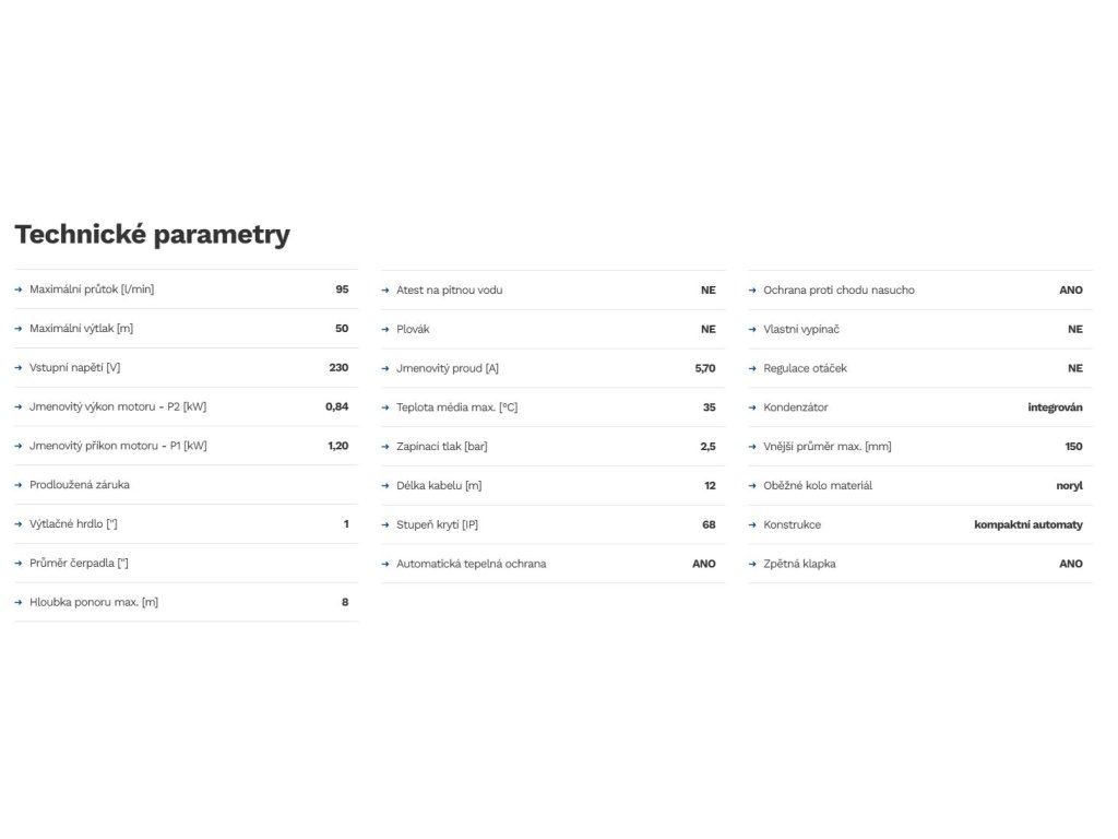 Čerpadlo má schopnost čerpat vodu 50 mm ze dna. Dodáváme s 12m kabelem. Čerpadlo dosahuje maximální výtlačné výšky až 50 m a max.hloubka ponoru čerpadla je 8 m.