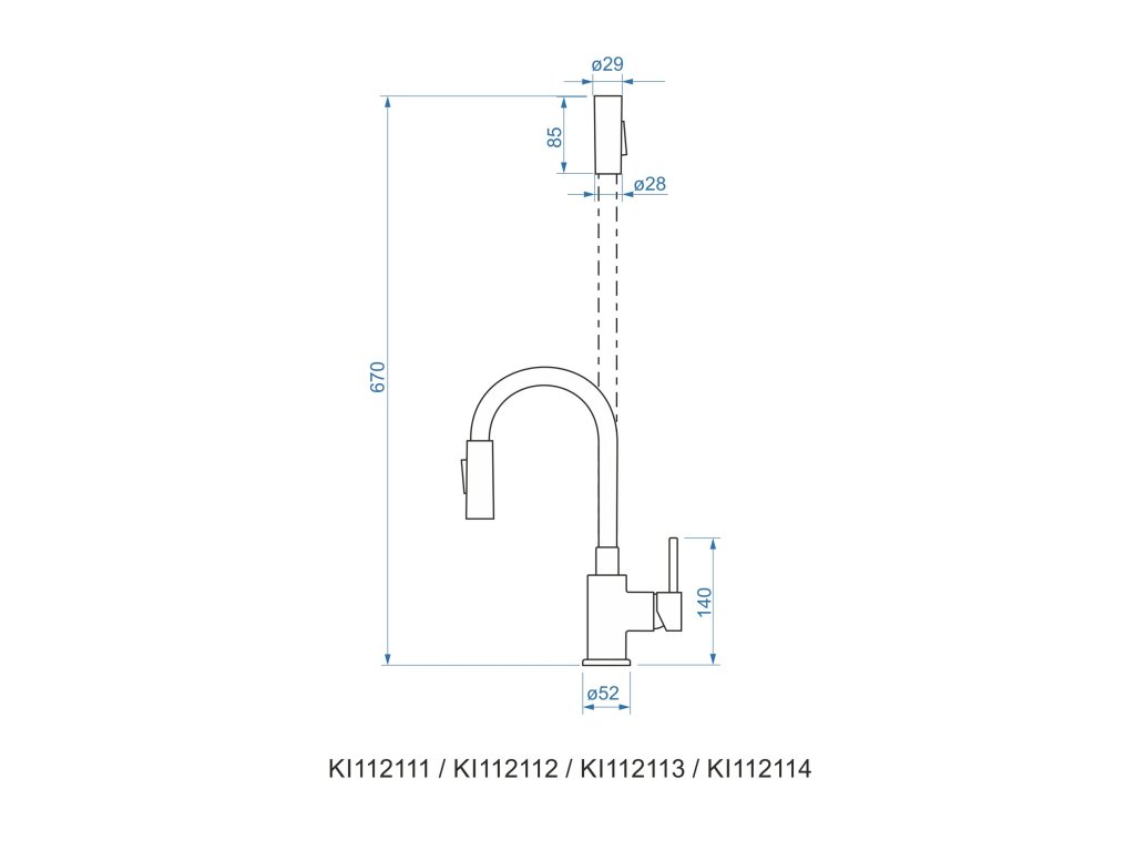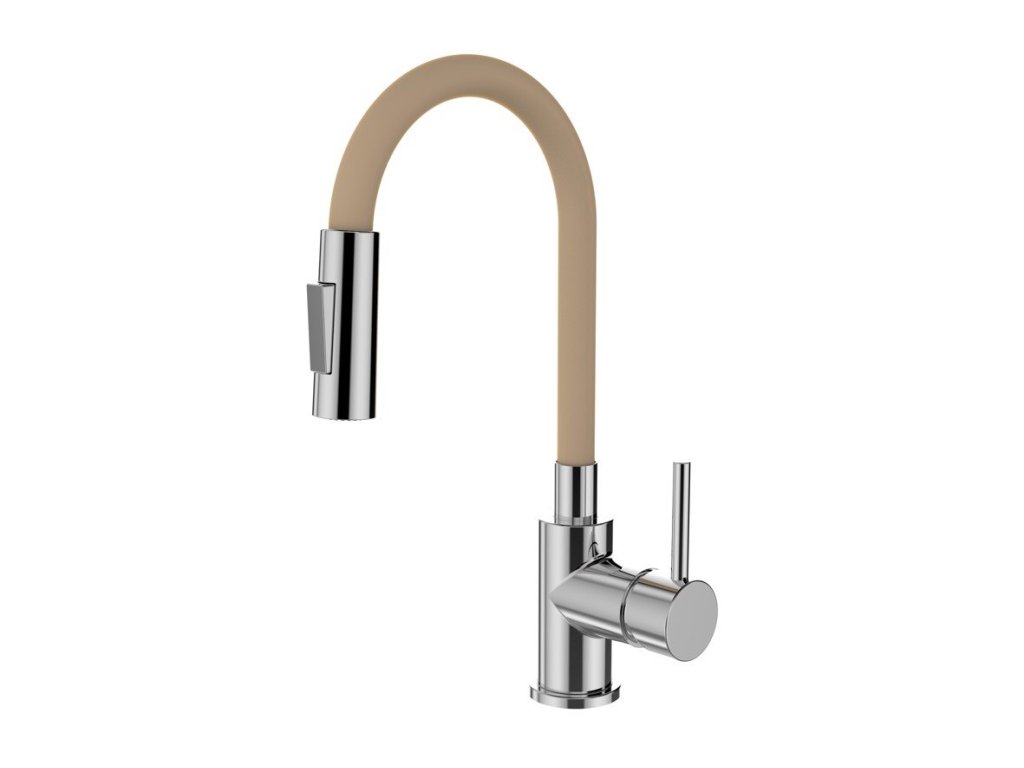 Solitérní baterie pro kuchyňský dřez s flexibilním ramínkem, zakončená sprškou se dvěma volitelnými režimy průtoku