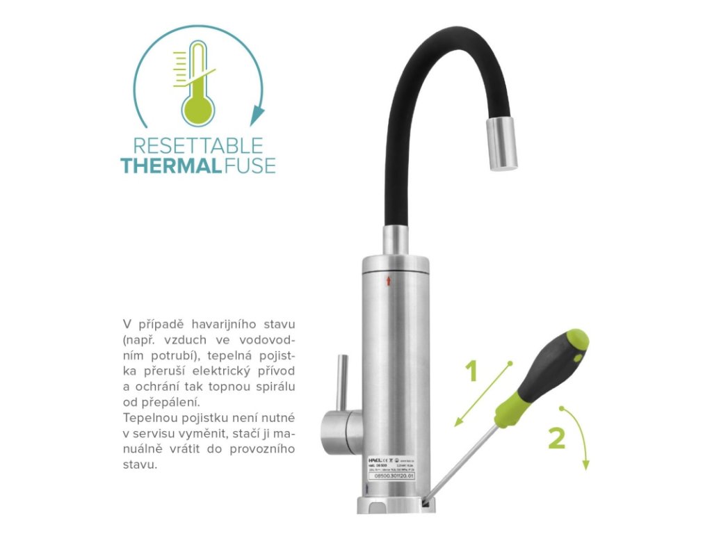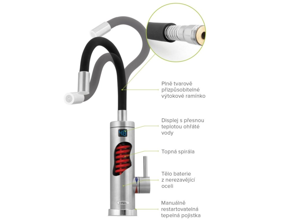Hlavní předností elektrické přímoohřevné baterie HAKL OB 500 je flexibilní tvarovatelné výtokové ramínko. Tato praktická vlastnost umožňuje přizpůsobení vzdálenosti výtoku vody při mytí nádobí. Tělo baterie vyrobené z nerezavějící oceli spolu s opakovaně restartovatelnou tepelnou pojistkou (při havarijním stavu bez nutnosti rozebrání baterie), dodávají výrobku výraznou odolnost. Uživatelský komfort umocňuje zónový aktivní perlátor, který automaticky uzavírá průchodnost kanálků v závislosti na množství proteklé vody.Doplňkové parametry