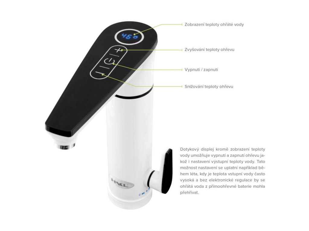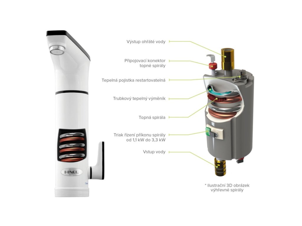 Přímoohřevná baterie HAKL OBR 330 má možnost regulace výkonu. Řídící elektronika omezuje ohřev v rozmezí od 30 ° C do 50 ° C, přičemž výkon topné spirály se automaticky reguluje od 1,1 kW do 3,3 kW. Automatické plynulé zvyšování nebo snižování příkonu topné spirály výrazně šetří nejen vodu ale i spotřebu elektrické energie. Patentovaný suchý ohřev Dry Heating, dotykový displej, regulace výkonu a dvojitá tepelná ochrana umisťuje tento výrobek mezi špičku ve své třídě.Doplňkové parametry