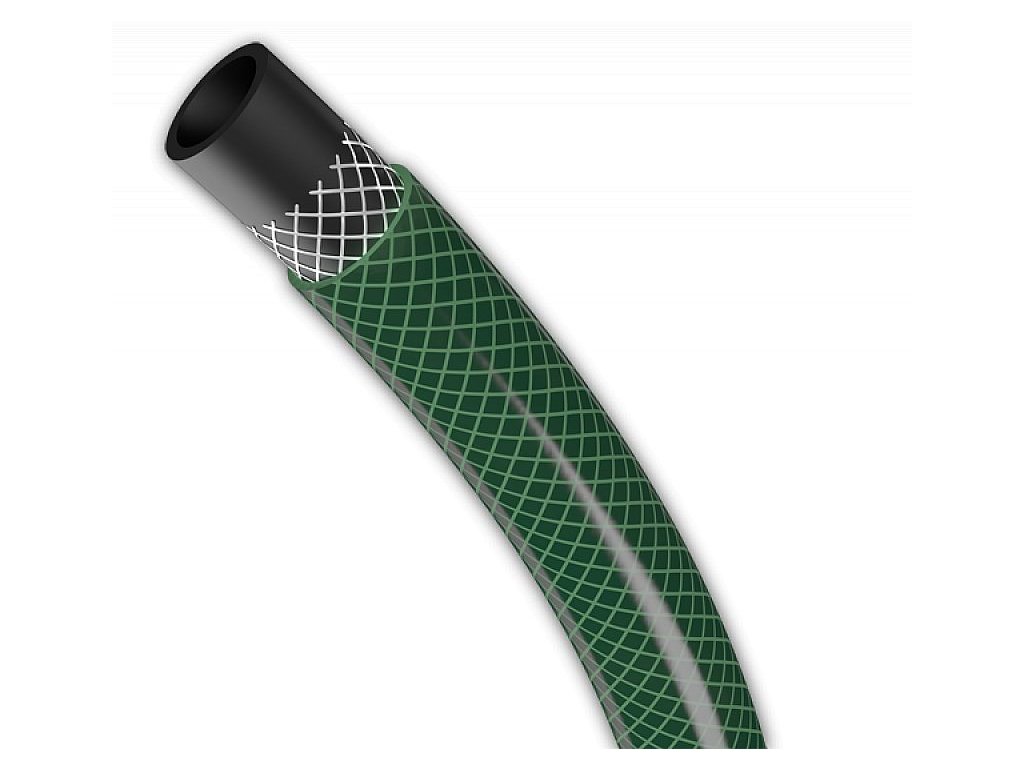 POPIS 3 vrstvá vyztužená zahradní hadice Sprint 3/4" z měkčeného PVC. 1.vrstva - vyrobená z černého PVC odolná vůči UV záření a ukládání řas v hadici 2.vrstva - pletená syntetická křížová vlákna 3.vrstva - vnější, světle zelené transparentní PVC