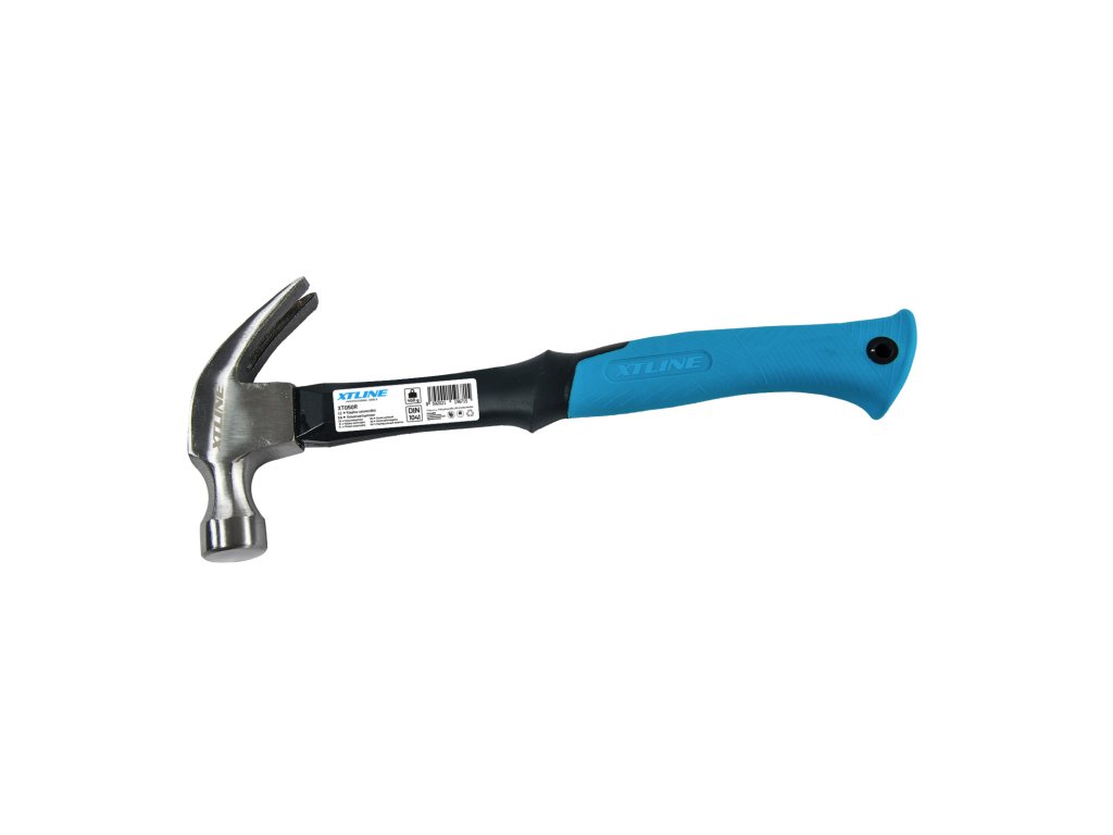 Kladivo s trhacími čelistmi, kulatá hlava s drážkami pro snadné zatloukání hřebíků, pogumovaná sklolaminátová násada.