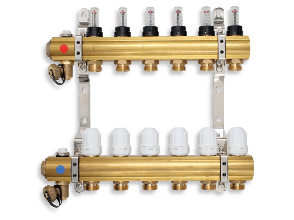 Mosazné rozdělovače pro 2-12 vytápěných okruhů osazené průtokoměry Taconova se zárukou 15 let. Kompletní sortiment příslušenství včetně náhradních dílů