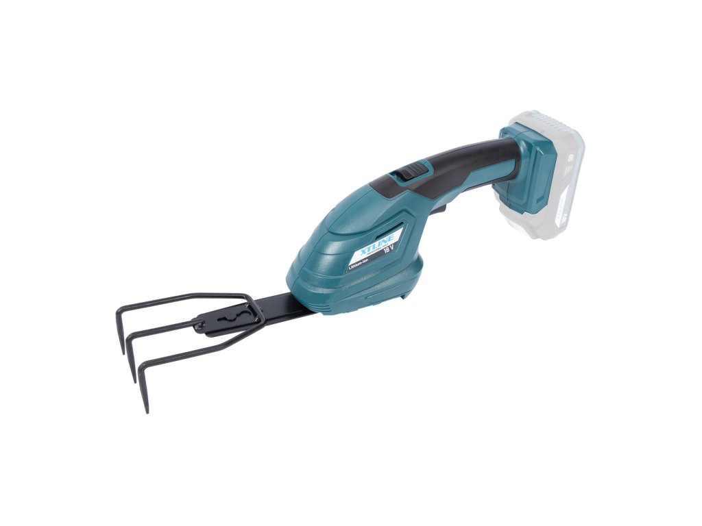 Max. záběr | nůžky na trávu 100 mm, nůžky na keře 200 mm / průměr 8 mm, hrábě 75 mm |